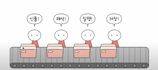 김밥 공장처럼 생각을 하면 더 쉽다. 김에 펴진 밥이 컨테이너 벨트를 타고 이동한다. 직원 1앞에서 오면 직원 1이 단무지를 추가한다 (인출). 옆 칸으로 이동하다 직원 2앞에 오면 직원 2가 햄을 추가한다(해석). 이처럼 김밥을 무한정 생산하는 김밥 공장이 바로 컴퓨터라고 생각하면 되는 것이다. 김밥은 곧 명령어이고 추가 되는 재료들은 처리 과정이다.