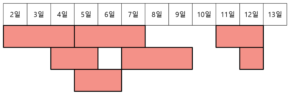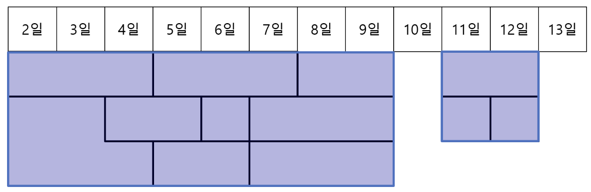 - 시작일이 같을 경우 일정의 기간이 긴 것이 먼저 채워진다.