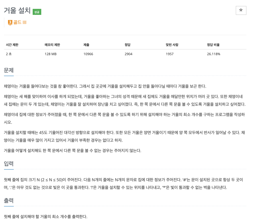 거울의 반사되는 조건과 기존에 자주 풀던 최단 경로가 아닌 도달할 수 있을 때 '거울의 최소 수'를 구하는 문제라서 더욱 어렵게 느껴졌다.