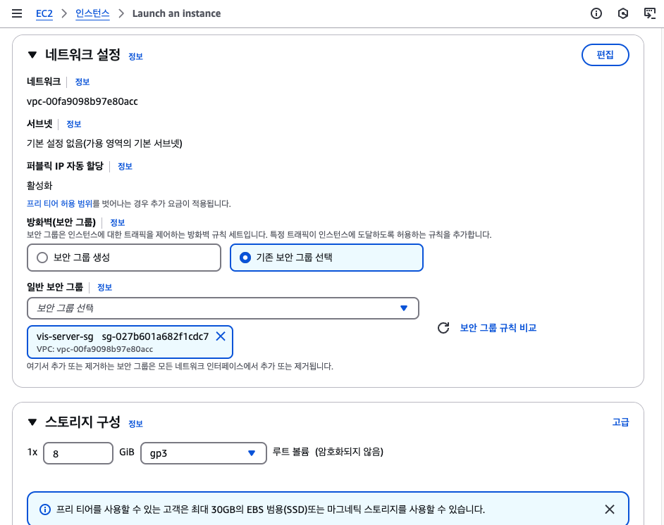 이렇게 보안그룹을 생성하고 마저 EC2 생성 창에서 기존 보안 그룹을 선택하여 생성한 보안 그룹을 적용한다. 그리고 인스턴스 시작을 누르면 끝난다.