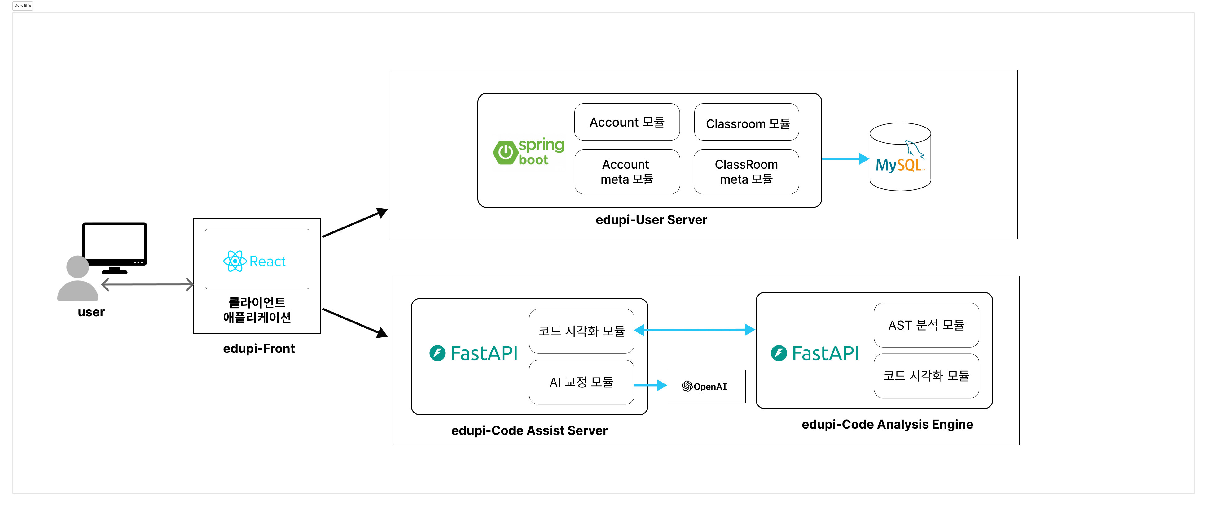 기존 구조는 MAS 구조로 아래와 같았다. 백엔드 서버만 총 6개로 스프링 서버 4개, FastApi 서버 2개로 이루어졌다.