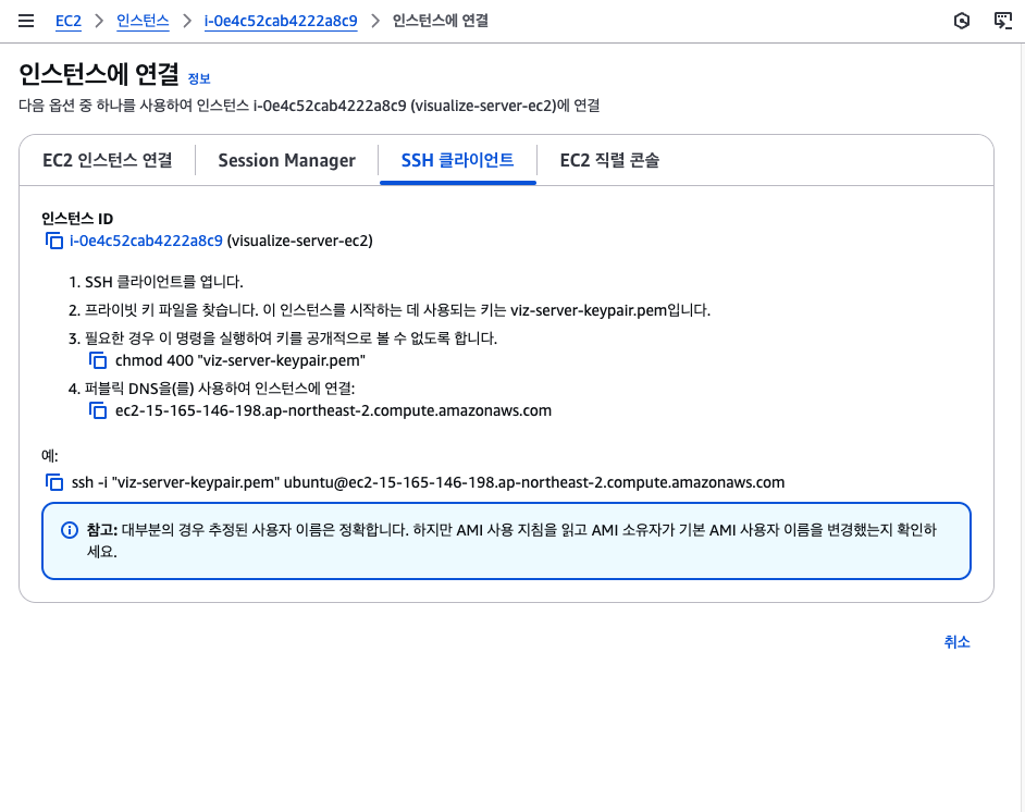 생성된 인스턴스의 ID를 클릭하고 연결 버튼을 누르면 아주 친절하게 명령어들이 나온다. 아래 작업 그대로 실행하면 된다. 터미널을 열어서 프라이빗 키 파일이 있는 곳으로 현재 디렉토리를 이동시킨 후, 3번 명령을 실행한다. 그리고 4번 말고 예: 밑에 있는 명령어를 복사해서 실행하면 EC2에 원격으로 접속할 수 있다.