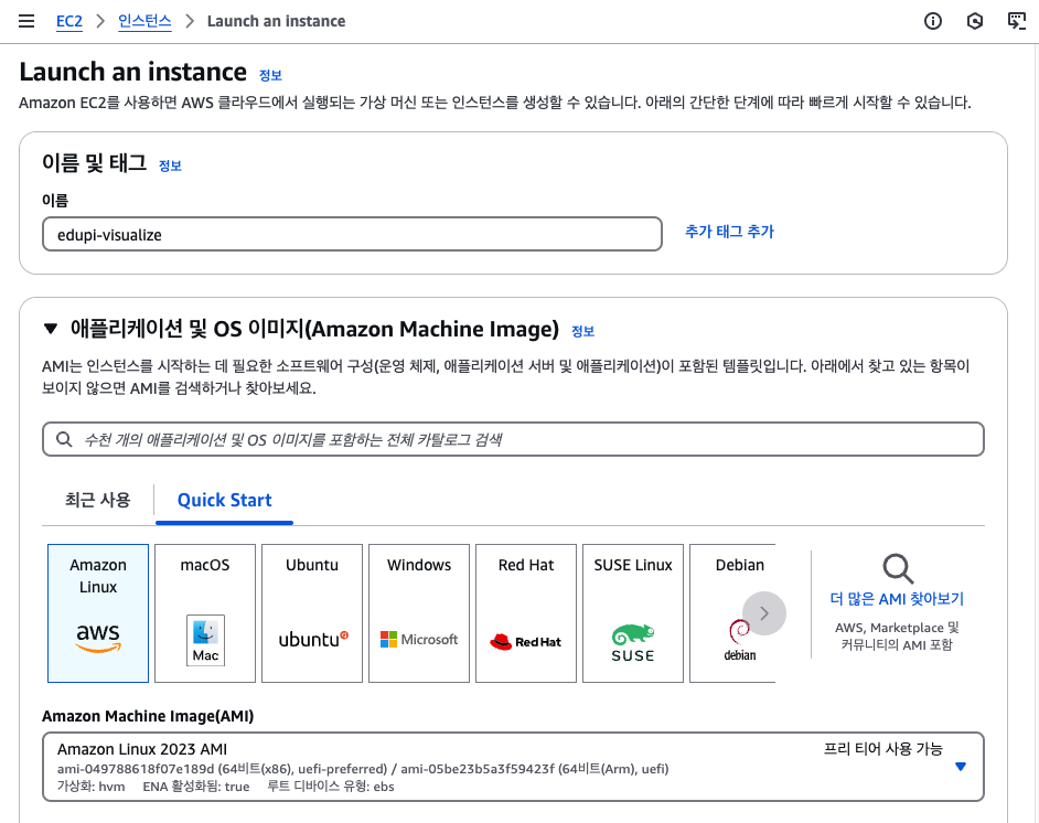 가장 먼저 EC2를 만들어야 한다. EC2 창에서 인스턴스 시작 버튼을 누른 후 이름을 입력하고 사용할 OS 이미지를 선택한다. 제일 기본인 Linux를 선택했다.