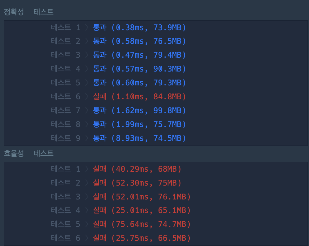 우선 정확성에서 모두 통과가 되야지 효율성을 따질 수 있나보다.