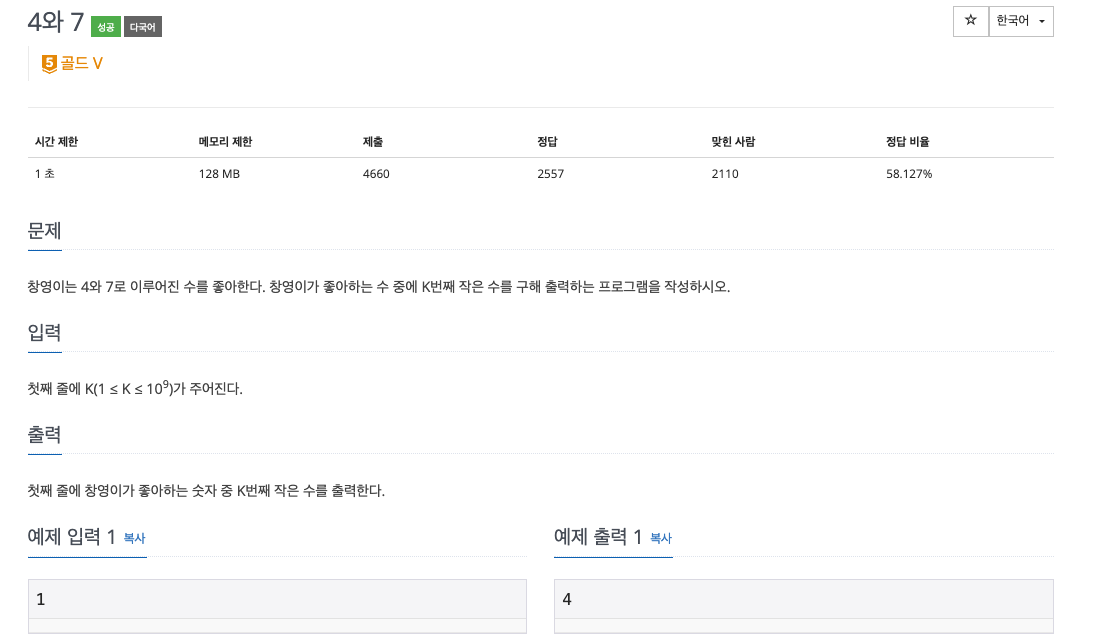 4와 7을 이용해서 K 번째 작은 수 만들기