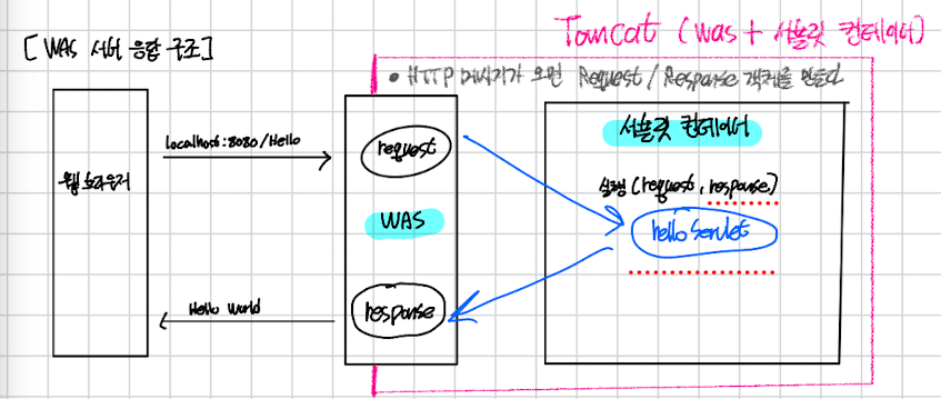 Tomcat처럼 서블릿을 지원하는 WAS를 서블릿 컨테이너라고 하며, 서블릿 객체는 싱글톤으로 관리한다. 또한 동시 요청을 위한 멀티 스레드 처리를 지원한다.