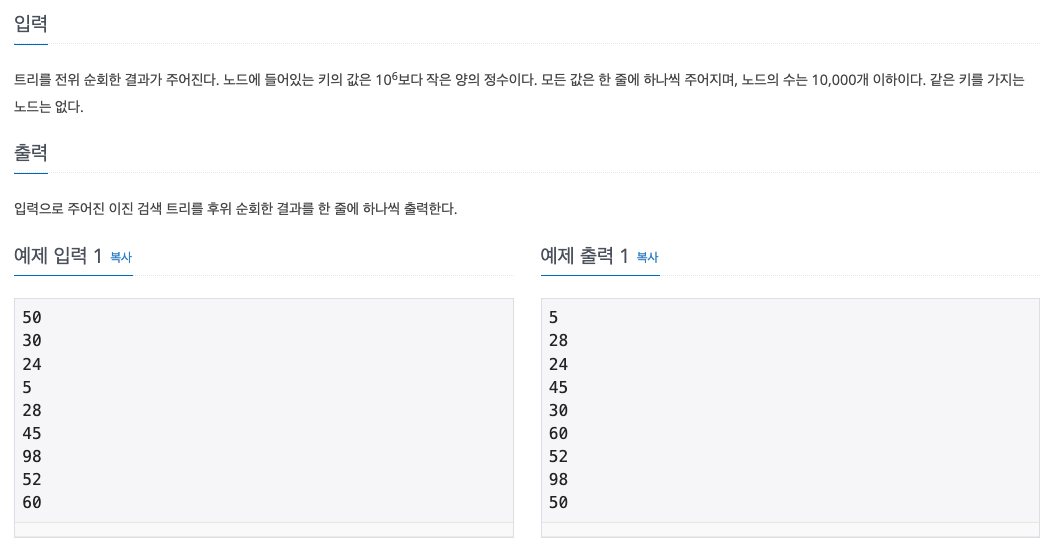 루트를 기준으로 아래로 비교하면서 하나씩 추가 하는 것이 가능한 이유는 전위 탐색 결과(무조건 루트, 왼쪽, 오른쪽 순)가 주어지고, 왼쪽과 오른쪽을 구분할 수 있는 이진 검색 트리의 특징 이 있기 떄문.