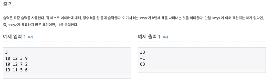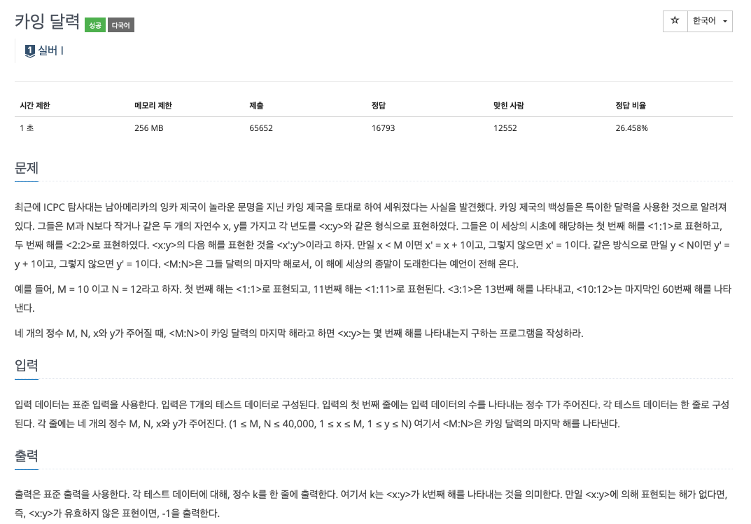 그러므로 입력으로 주어진 x,y가 몇 번째 해를 아는지 알기 위해서는 결국 아래 두 조건을 만족시키는 최소 공배수가 필요하다.