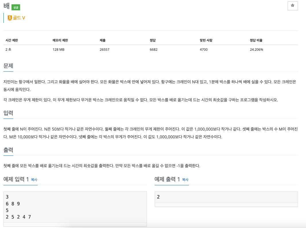 이 두가지 조건을 중심으로 생각했다. 최소의 시간이 걸리기 위해서는 크레인들에게 균형있게 화물을 분배해줘야 한다. 이때 무게가 작은 박스는 어떠한 크레인이든 사용할 수 있지만, 무게가 커질 수록 사용할 수 있는 크레인은 적다. 그러므로 무게가 무거운 박스를 어떻게 분배하면 좋을지 생각했다.