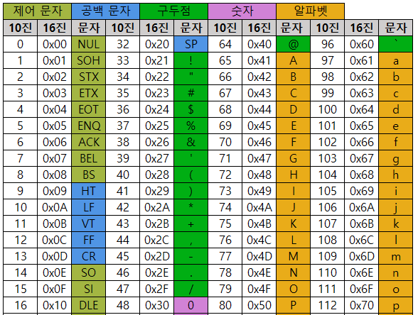 - 알파벳, 아리비아 숫자, 일부 특수 문자 및 제어 문자 표현