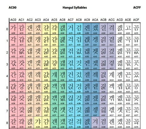 - U+는 16진수를 나타내며, 실제 할당된 코드는 AC00이다.