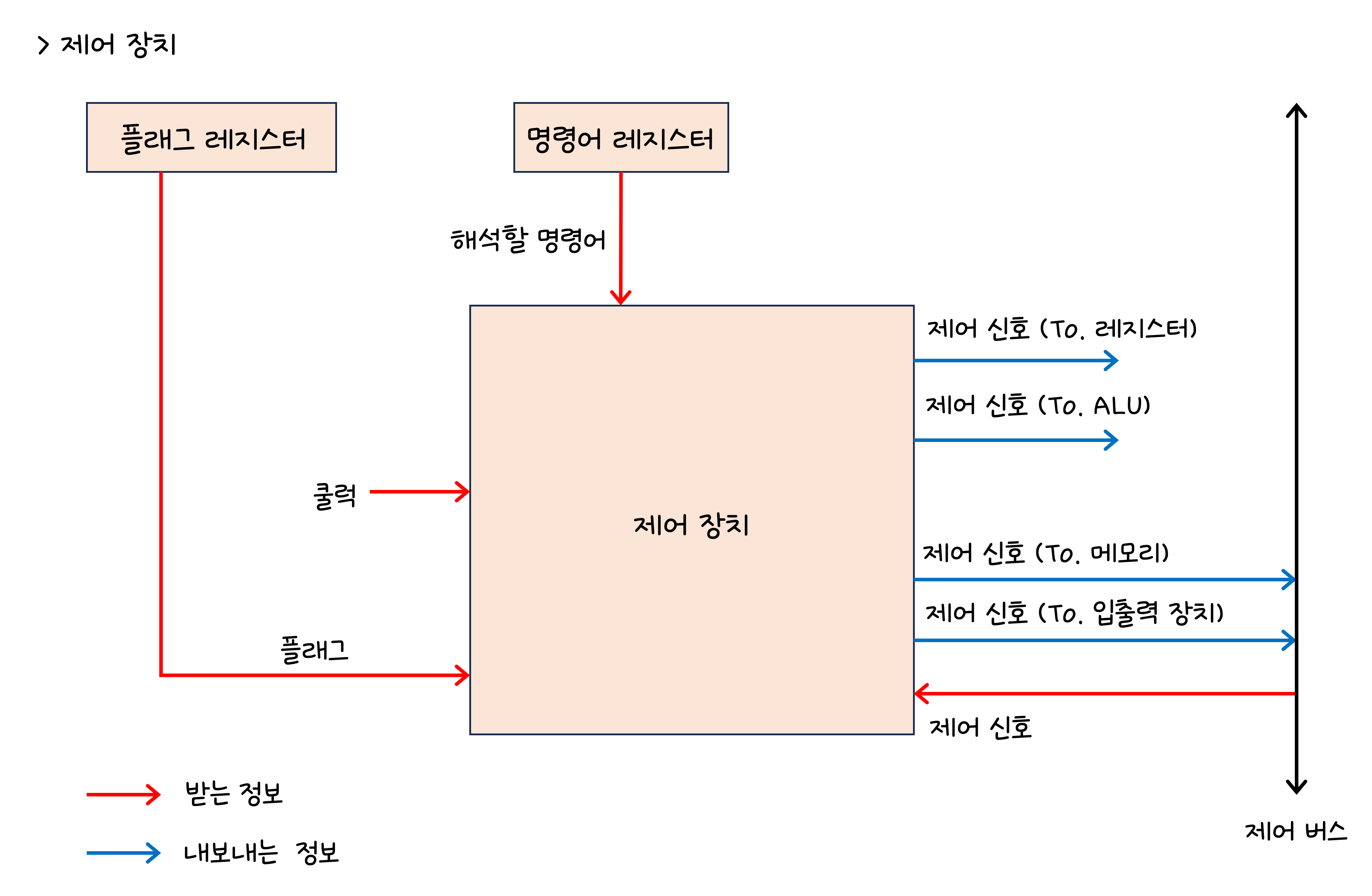 제어 장치는 말 그대로 CPU를 제어하는 장치로 명령어를 해석하거나, 실행한다. 제어 장치가 어떤 정보를 받아들이고 내보내는지 알아보자.
